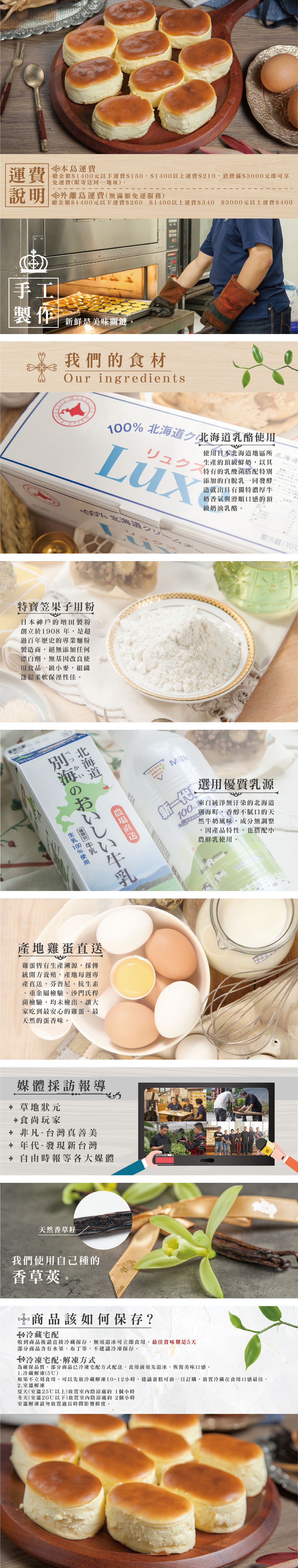- 北海道luxe乳酪、日本果子低筋麵粉、牛奶、蛋、香草籽