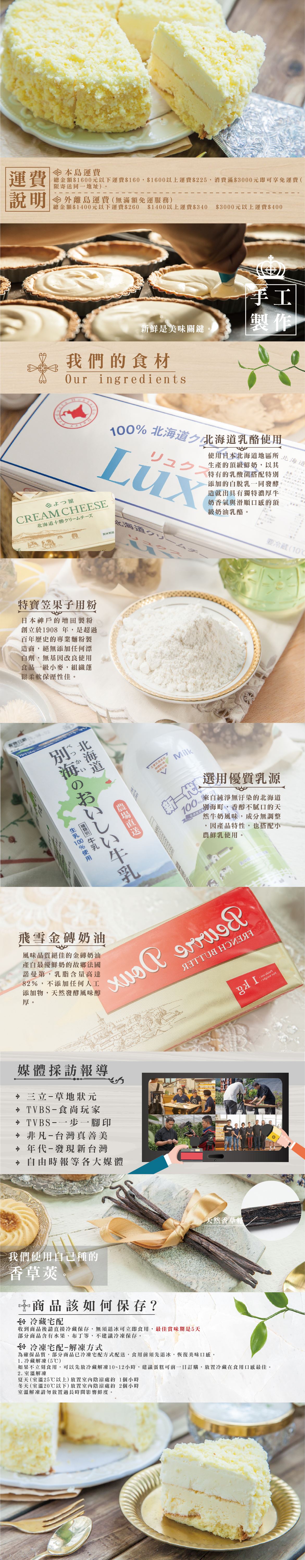 - 日本麵粉、雞蛋、法國鮮奶油、北海道LUXE乳酪、寒天、糖、蜂蜜、台灣香草莢。