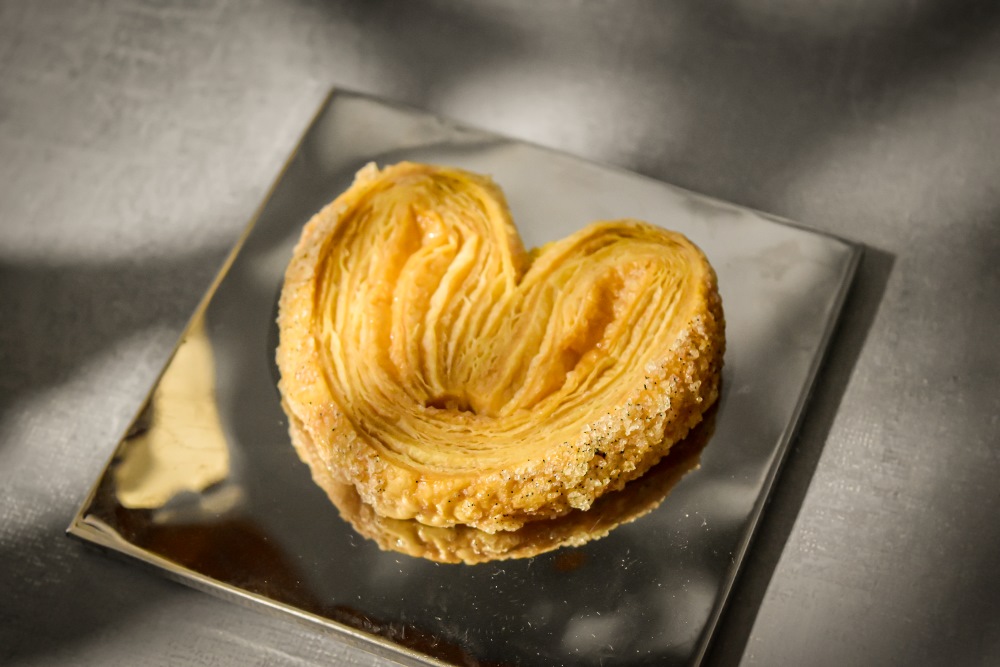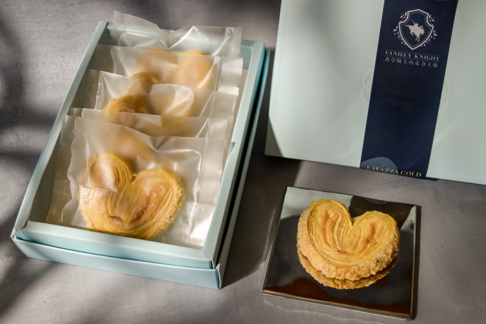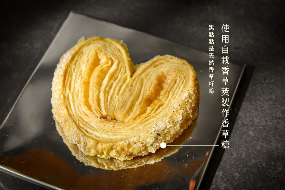 香草千層愛心酥結合了傳統法式烘焙技藝與台灣特色食材,這款產品以千層酥為基礎,製作成愛心形狀,每一層酥皮都經過層層摺疊與烘烤,呈現出酥脆的口感和豐富的層次感,最特別的是,酥皮上均勻地沾裹著手工製作的自栽台灣香草糖,為每一口增添純正的台灣香草風味。